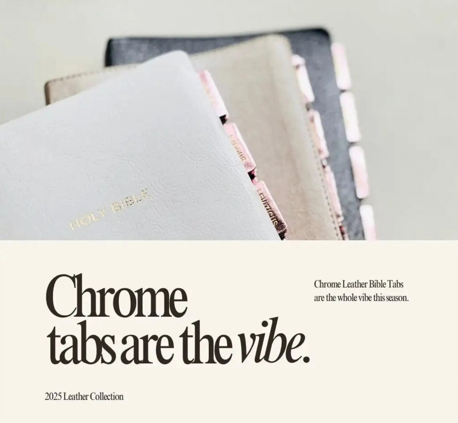 We're getting everything ready behind the scenes! We can't wait for you to check out our exclusive drop of Chrome Leather Bible Tabs and devotional accessories-we are OBSESSED! Be sure to follow us on social to be the first to know about our Bible Grl Pen Pal Club, Gift Exchanges, Giveaways & more!